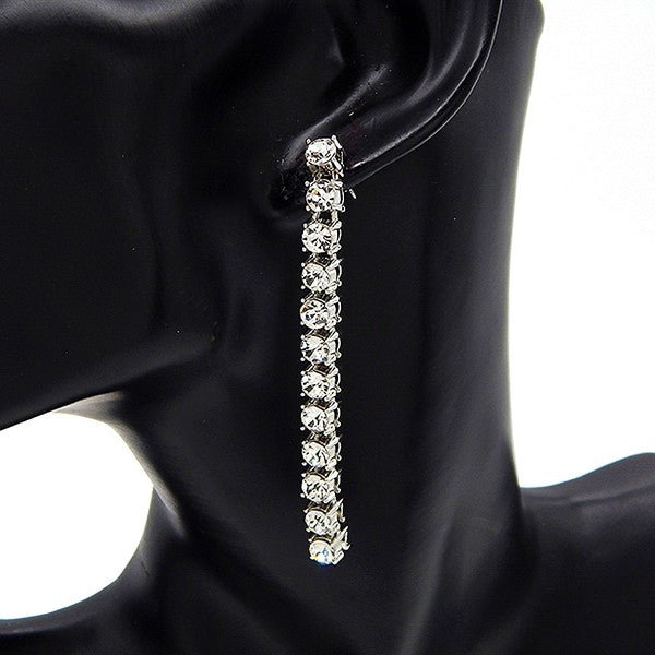 - These elegant tennis chain earrings feature sparkling 5mm rhinestones secured in a four-prong basket or crown setting, extending to a dramatic 70mm length.