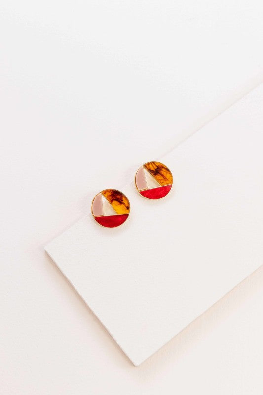 A circular earring that perfectly resembles beautiful stained glass! With a deep red, burnt orange, pale pink, and a touch of gold, these colors are sure to make you pop.