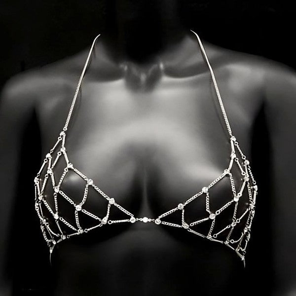 - This Wide Net Chain Rhinestone Base Bra Body Chain is a stunning and glamorous accessory that will make your outfit pop.