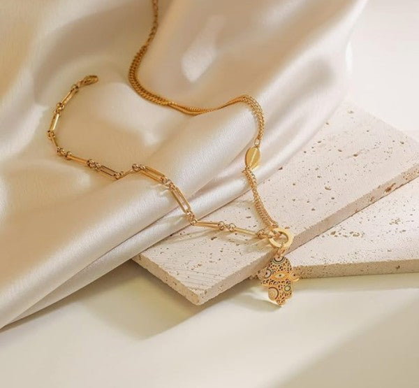 This elegant and modern necklace showcases an intricately designed Hamsa pendant with vibrant enamel accents, symbolizing protection and positivity. The dual-chain design, featuring a mix of cable and elongated link chains, adds a stylish and contemporary touch, making it a versatile accessory for any occasion.