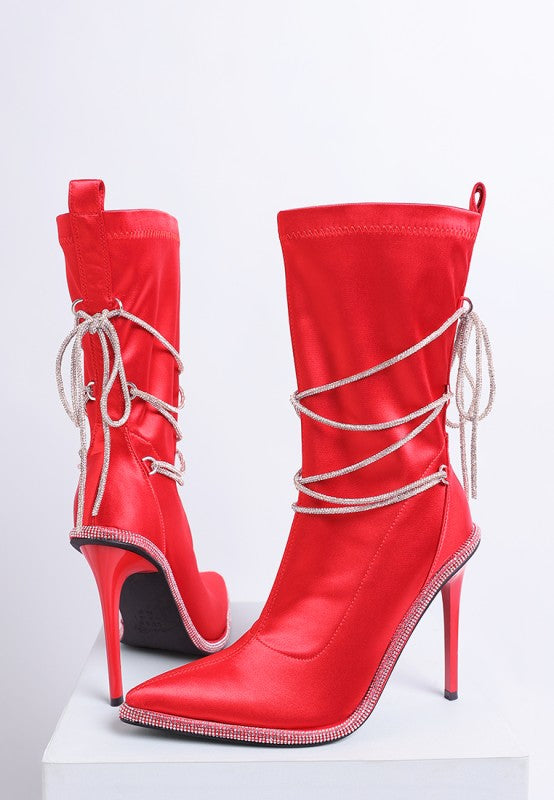 The metallic satin boots are so chic and glamorous with the alluring rhinestones embellished strap wrap around. The stiletto boots have pull tabs, making them easy to wear, and comfortable cushion insoles that cut strain.